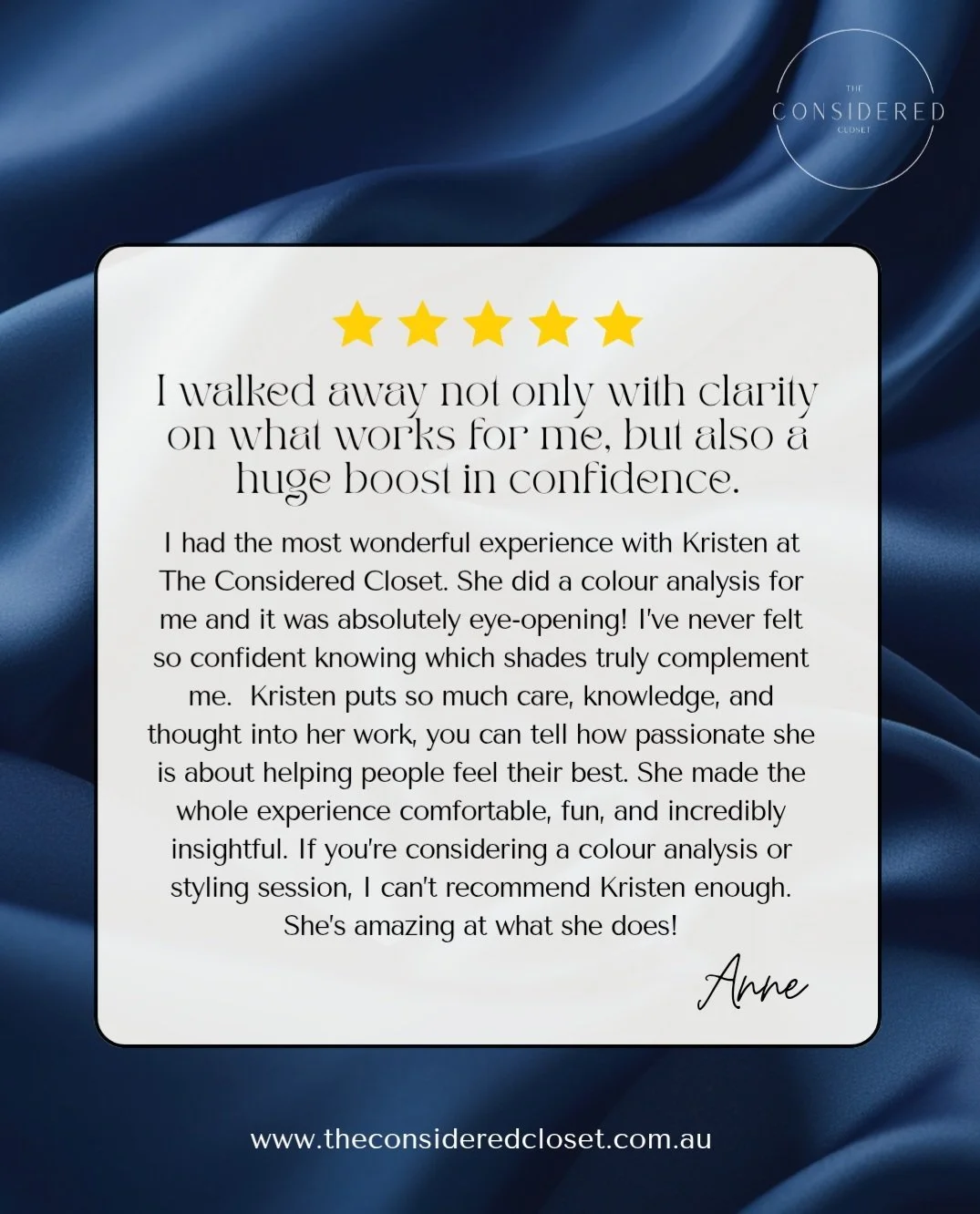 Trained in Colour Analysis through The Italian Image Institute (Rosella Migliaccio’s Armocromia method) and The Australian College of Professional Styling, Kristen helps women discover the shades that harmonise with their unique features. Kristen is currently completing a broader professional styling certification for film, television, fashion and personal styling so you’ll benefit from fresh, up-to-date advice and expertise tailored to you.